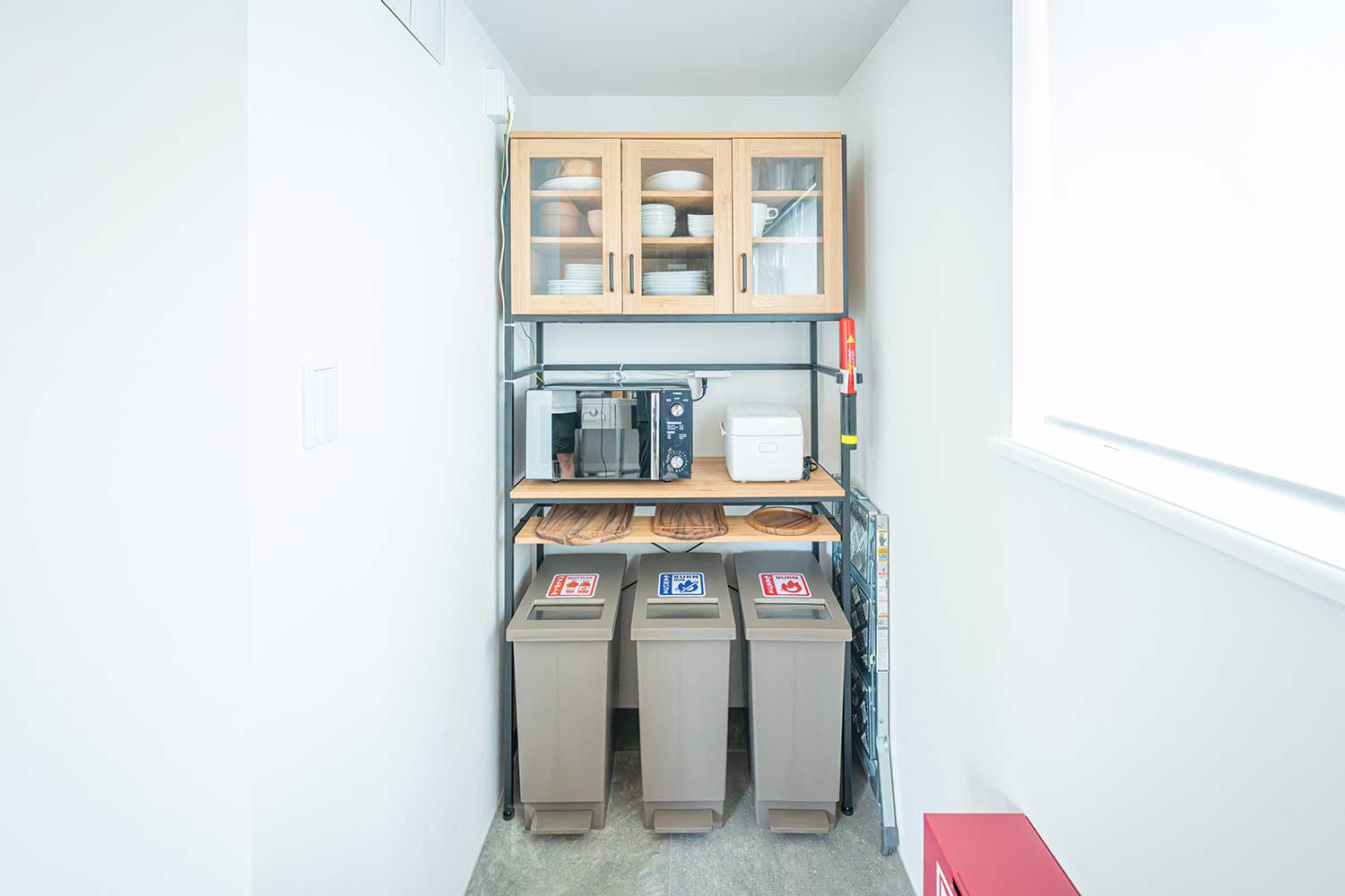 キッチン設備 | 炊飯器、電子レンジ、電気ケトル、トースター、鍋・フライパン類、食器類、カトラリー、グラス・コップ類、包丁、まな板、料理ばさみ、トング、クーラーボックス、スポンジ、食器洗剤、ハンドソープ、アルコール消毒液、キッチンペーパー、ふきん |